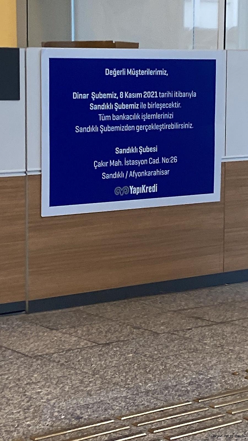 Dinar İlçemizde Adliye Mahallesinde 2008 yılında açılan 13 yıldır bölge halkına hizmet veren, Yapı Kredi Bankası Dinar Şubesinin iddialara göre 08.11.2021 tarihi itibari ile kapanacağı bildirildi.