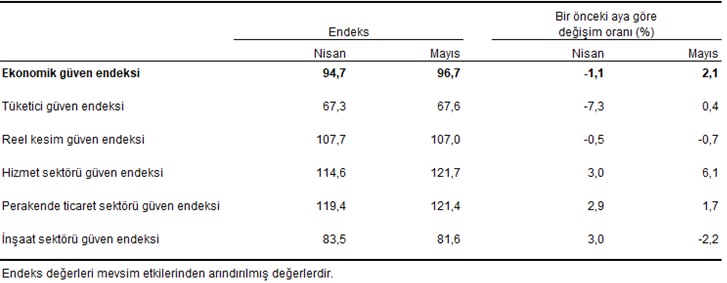 Bir önceki aya göre Mayıs ayında tüketici güven endeksi %0,4 oranında artarak 67,6 değerini, hizmet sektörü güven endeksi %6,1 oranında artarak 121,7 değerini, perakende ticaret sektörü güven endeksi %1,7 oranında artarak 121,4 değerini aldı. Reel kesim (imalat sanayi) güven endeksi %0,7 oranında azalarak 107,0 değerini, inşaat sektörü güven endeksi %2,2 oranında azalarak 81,6 değerini aldı.
