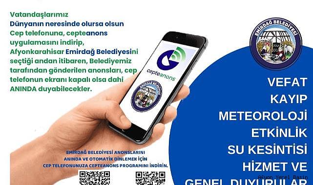 Gelişen teknoloji ile vatandaşlarına daha iyi hizmet sunmayı hedefleyen Emirdağ Belediyesi, sesli anonsları mobil cihazlara gönderme hizmetini hayata geçirdi. Mobil uygulama ile vatandaş yapılan anonsları sesli olarak dinleyebiliyor. Gürültü kirliliğin önüne geçilmesini amaçlayan sistemle, belediye hoparlörüne olan ihtiyacın azaltılması planlanıyor.Gerek yurt içi gerekse yurtdışındaki tüm vatandaşlar; vefat, kayıp, su kesintisi, etkinlik, meteoroloji, hizmet ve genel duyuruları cepte anons uygulaması ile cep telefonlarından takip edilebilecek.Cepte anons uygulamasını telefonlarına indiren vatandaşlar uygulamaya giriş yaparak Afyonkarahisar Emirdağ Belediyesi’ni seçtikten sonra yapılan duyurulara sesli ve yazılı şekilde erişebilecek. Cepte anons uygulaması aynı zamanda hayat kurtaran bir uygulama olarak da ön plana çıkıyor. İçerisinde yer alan acil durum siren sesi ile olası bir depremde göçük altında kalan ya da herhangi bir afet durumunda zor durumda olan vatandaşlara ulaşmakta ekiplere kolaylık sağlayacak.Görevlerinin vatandaşlara daha nitelikli hizmet sunmak olduğunu vurgulayan Emirdağ Belediye Başkanı Serkan Koyuncu; "Emirdağ Belediyesi olarak teknolojiyi yakından takip ederek vatandaşlarımızın hayatını kolaylaştırmaya devam ediyoruz. Uygulamaya geçirdiğimiz Cepte Anons sistemi ile bundan sonra Emirdağ Belediyesi'ne ait tüm anonslar cep telefonuna gelecek. Uygulama sayesinde yaptığımız ilanları tüm dünyaya anında ücretsiz olarak duyurabileceğiz."ifadelerini kullandı.