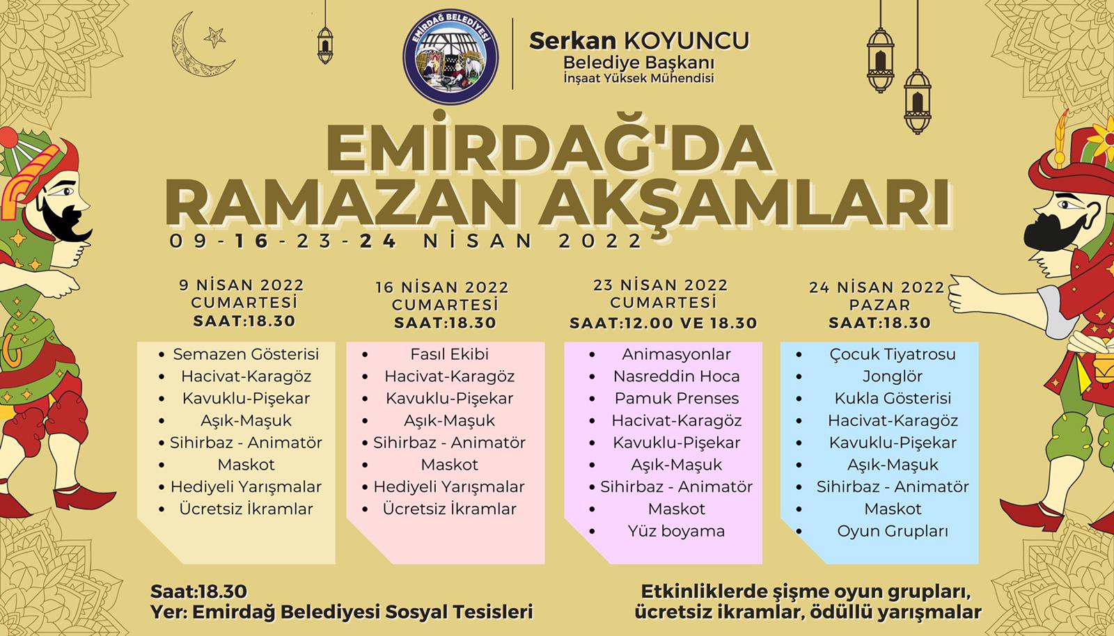 Ramazan etkinlikleri çerçevesinde düzenlenen programda, kukla gösterileri, gölge oyunu, animatör eğlenceleri, fasıl ekibi, semazen gösterileri ile bu yılki Ramazan Şenliği eğlenceleri 9 - 16 - 23 ve 24 Nisanda dolu dolu yaşanacak.Emirdağ Sosyal Tesislerde hem çocuklar hem de aileler için belirli akşamlarda birbirinden ilginç programlar yer alacak. Ailecek izlenebilecek 7’den 70 herkese hitap eden Karagöz Hacivat Gölge Oyunları, Kukla Performansları, animatör, maskot eğlenceleri, masal kahramanları, Orta oyunları, fasıllar ,sihirbazların olduğu farklı dallarda sahne gösterileri ile renklendirilecek olan emirdağ belediyesi Ramazan Şenliği etkinliklerinde misafirlere, Osmanlı şerbeti, Osmanlı macunu, pamuk şeker, elma şekeri, pop corn,kağıt helva, gibi tatlar ücretsiz ikram edilecek.Ramazan Şenlikleri kapsamındaki etkinliklerin ilki 9 Nisan 2022 Cumartesi günü Semazen gösterisi, kukla gösterisi ve gölge oyunuyla başlıyor.Emirdağ Belediye Başkanı Serkan Koyuncu tüm hemşehrilerini yapılacak olan Ramazan Şenliğine davet etti. Başkan Koyuncu mesajında "Bu ruhu yaşamayı ve yaşatmayı çok özlemişiz. Akşamları iftardan sonra şenlik alanında hem çocuklarımız hem de yetişkinler için birbirinden farklı programlar düzenleyeceğiz. Hemşehrilerimizin eski ramazanları tekrar bulacağı Ramazan şenliklerimize bütün vatandaşlarımızı davet ediyorum." ifadelerini kullandı. Sözlerinin devamında ise ; "Bizler, Emirdağlıların en iyisine layık olduğunu düşünüyoruz. Bunun için önümüzdeki Ramazanları daha güzel, daha büyük aktivitelerle yaşatmaya devam edeceğiz. Hemşehrilerimizi hem keyiflendireceğiz hem de sürpriz hediyelerle buluşturacağız’’ ifadelerine yer verdi.