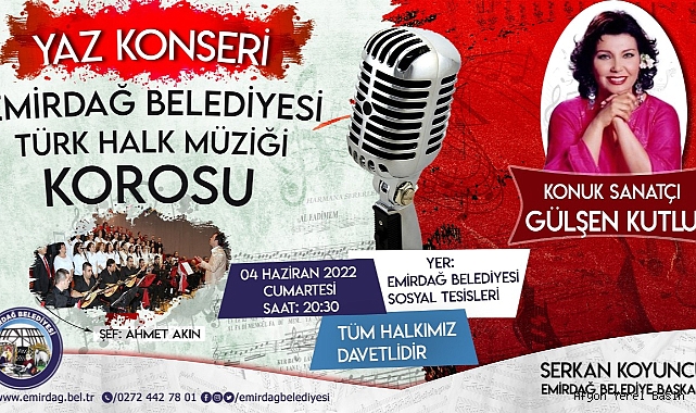 Emirdağ Belediyesi’nin kültürel etkinlikleri kapsamında Türk Halk Müziğinin güçlü ve sevilen sesi Gülşen Kutlu, Emirdağ'da türküseverlerle buluşacak.Türk Halk Müziği Sanatçısı Gülşen Kutlu ile Emirdağ Belediyesi Türk Halk Müziği Koro şefi Ahmet Akın yönetimindeki Türk Halk Müziği Korosunun sahne alacağı konser, 4 Haziran 2022 Cumartesi günü saat 20.30’da Emirdağ Sosyal Tesislerinde gerçekleşecek.Emirdağ Belediye Başkanı Serkan Koyuncu, "Emirdağlı hemşehrilerimizden oluşan ve Ahmet Akın hocamızın 9 ay emek verdiği belediyemiz Türk Halk Müziği Koromuz ilk Konserine Gülşen Kutlu ile birlikte çıkıyor.Cumartesi günü tüm hemşehrilerimizi ve türküsever dostlarımızı Sosyal Tesislere bekliyoruz."ifadelerini kullandı.