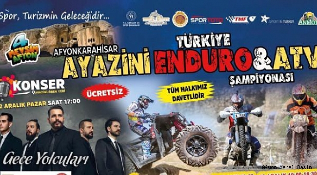 Belediye Başkanı Mehmet Zeybek’in atılımları ile yaz kış demeden, dört mevsim etkinliklerin yapıldığı şehir haline gelen Afyonkarahisar, bu kez de Türkiye Enduro ve ATV Şampiyonasına ev sahipliği yapacak. Spor şehri Afyonkarahisar bu alanda önemli etkinlikleri hayata geçirmeye devam ediyor. ‘4 Mevsim Afyon’ projesi kapsamında Belediye Başkanımız Mehmet Zeybek, şehrimizi kültürel ve sanatsal etkinlikler ile buluşturmaya devam ediyor. Ülkemizde geniş kitlelere hitap eden Türkiye Enduro ve ATV Şampiyonalarının son ayak yarışları 11-12 Aralık tarihinde Belediyemizin destekleriyle İhsaniye ilçesine bağlı Ayazini Ören Yerinde yapılacak.