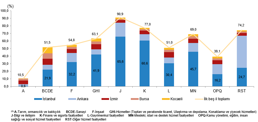 İstanbul, "tarım, ormancılık, balıkçılık" ve "diğer hizmet faaliyetleri" hariç, tüm faaliyetlerde en yüksek payı aldı
