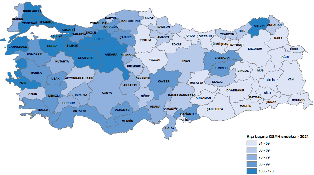 Kişi başına GSYH'de 2021 yılında, Kocaeli 153 bin 479 TL ile ilk sırada yer aldı. Kocaeli'ni, 140 bin 698 TL ile İstanbul ve 132 bin 803 TL ile Tekirdağ izledi. İl düzeyinde kişi başına GSYH hesaplamalarında, 27 bin 790 TL ile Van, 27 bin 48 TL ile Şanlıurfa ve 26 bin 837 TL ile Ağrı son üç sırada yer aldı.