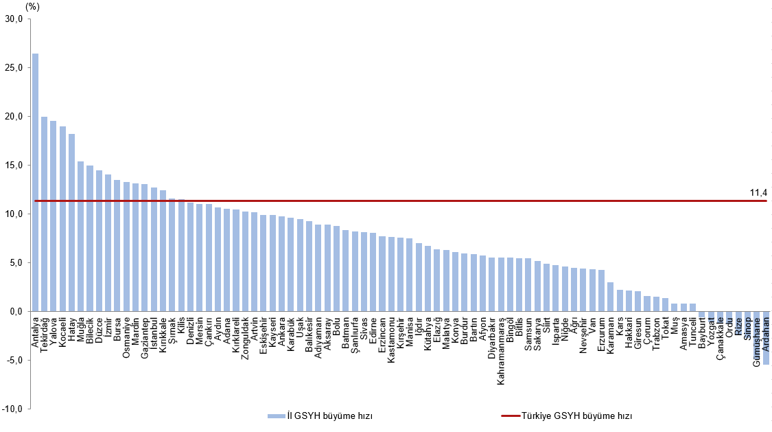 Yıllık GSYH, zincirlenmiş hacim endeksiyle 2021 yılında bir önceki yıla göre %11,4 artarken, 17 ilde Türkiye ortalamasının üzerinde artış gerçekleşti. Bir önceki yıla göre 2021 yılında en yüksek artış gösteren ilk üç il sırasıyla %26,5 değişim oranı ile Antalya, %20,0 ile Tekirdağ ve %19,6 ile Yalova oldu. Bir önceki yıla göre en yüksek azalış gösteren üç il ise sırasıyla %2,7 değişim oranı ile Sinop, %4,8 ile Gümüşhane ve %5,4 ile Ardahan oldu.