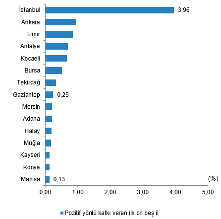 Yıllık GSYH'nin, zincirlenmiş hacim endeksiyle bir önceki yıla göre %11,4 artışına en fazla katkı veren il %3,96 ile İstanbul oldu. İstanbul'u %0,95 ile Ankara ve %0,85 ile İzmir izledi. Yıllık GSYH büyümesine 2021 yılında negatif yönlü katkı veren illerin başında %0,007 ile Ordu, %0,008 ile Rize, %0,009 ile Çanakkale yer aldı.