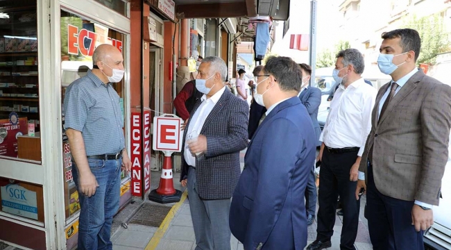 Vali Gökmen Çiçek ve Belediye Başkanı Mehmet Zeybek vatandaşlara duyarlılık konusunda uyarılar yaparken maske ve dezenfektan dağıtımı da yaptı.