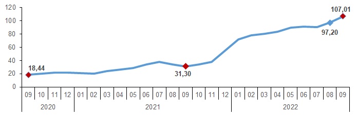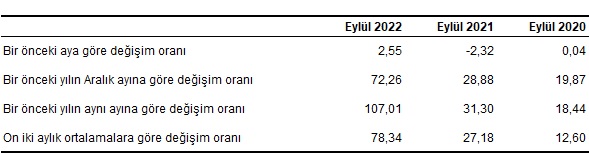 H-ÜFE (2017=100) 2022 yılı Eylül ayında bir önceki aya göre %2,55, bir önceki yılın Aralık ayına göre %72,26, bir önceki yılın aynı ayına göre %107,01 ve on iki aylık ortalamalara göre %78,34 artış gösterdi.