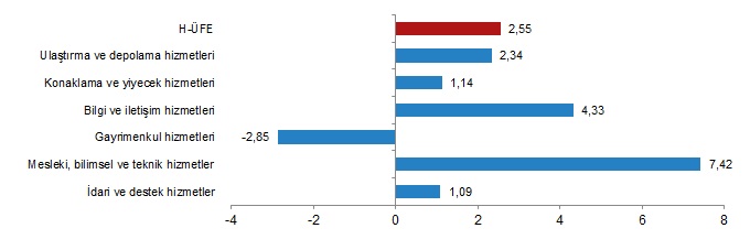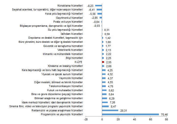H-ÜFE sektörlerinden konaklama hizmetleri %8,23, seyahat acentesi, tur operatörü, diğer rezervasyon hizmetleri ve ilgili hizmetler %6,41, hava yolu taşımacılığı hizmetleri %5,56 ile endekslerin en fazla azalış gösterdiği alt sektörler oldu. Buna karşılık programcılık ve yayıncılık hizmetleri %70,46, reklamcılık ve piyasa araştırması hizmetleri %20,31, sinema filmi, video ve televizyon programı yapımcılık hizmetleri, ses kaydı ve müzik yayımlama %8,47 ile endekslerin en fazla arttığı alt sektörler oldu.