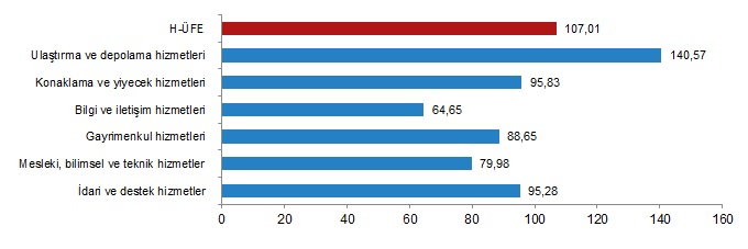 H-ÜFE sektörlerinden telekomünikasyon hizmetleri %39,48, hukuk ve muhasebe hizmetleri %43,46, sinema filmi, video ve televizyon programı yapımcılık hizmetleri, ses kaydı ve müzik yayımlama %57,09 ile endekslerin en az arttığı alt sektörler oldu. Buna karşılık posta ve kurye hizmetleri %177,31, hava yolu taşımacılığı hizmetleri %163,88, su yolu taşımacılığı hizmetleri %141,01 ile endekslerin en fazla arttığı alt sektörler oldu.