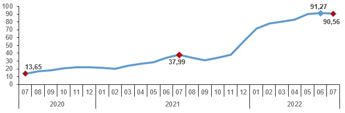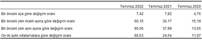 H-ÜFE (2017=100) 2022 yılı Temmuz ayında bir önceki aya göre %7,42, bir önceki yılın Aralık ayına göre %60,15, bir önceki yılın aynı ayına göre %90,56 ve on iki aylık ortalamalara göre %66,53 artış gösterdi.