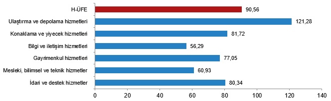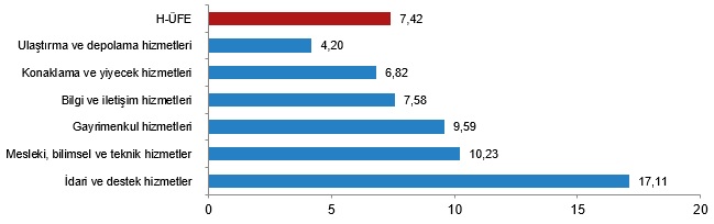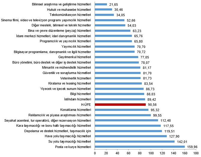H-ÜFE sektörlerinden bilimsel araştırma ve geliştirme hizmetleri %21,65, hukuk ve muhasebe hizmetleri %30,46, telekomünikasyon hizmetleri %34,05 ile endekslerin en az arttığı alt sektörler oldu. Buna karşılık posta ve kurye hizmetleri %159,96, su yolu taşımacılığı hizmetleri %142,01, hava yolu taşımacılığı hizmetleri %127,90 ile endekslerin en fazla arttığı alt sektörler oldu.