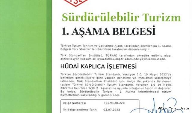HÜDAİ KAPLICALARI SÜRDÜRELEBİLİR TURİZM SERTİFİKASINI ALDI