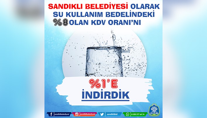 Cumhurbaşkanımız Sayın Recep Tayyip Erdoğan’ın açıkladığı “Mal ve Hizmetlere Uygulanacak Katma Değer Vergisi Oranlarının Tespitine İlişkin Kararda Değişiklik Yapılmasına Dair Cumhurbaşkanlığı Kararı”nın Resmi Gazetede yayınlanmasıyla yürürlüğe girmesiyle birlikte, Belediye Başkanımız Mustafa Çöl’ün talimatlarıyla içme suyu tarifesinde uygulanan %8’lik KDV oranı %1’ düşürüldü.