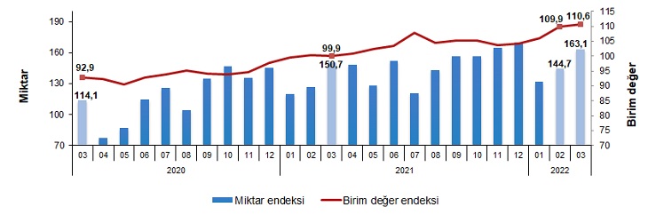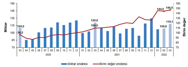 İhracat birim değer ve miktar endeksleri, Mart 2022