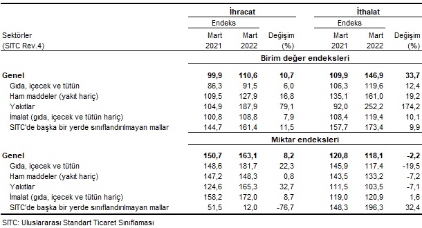 Dış ticaret endeksleri, Mart 2022