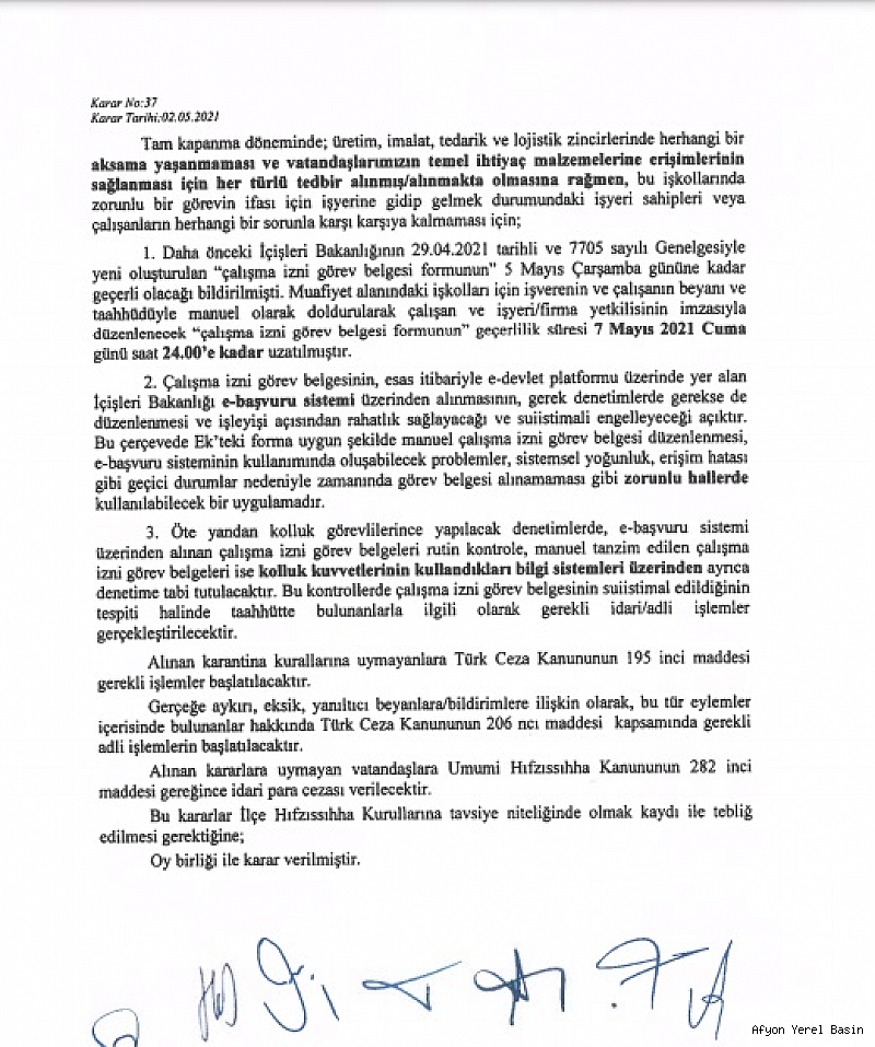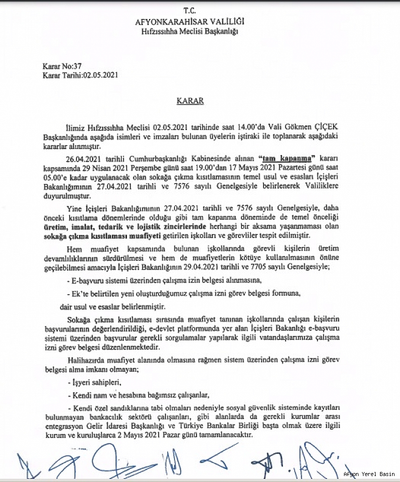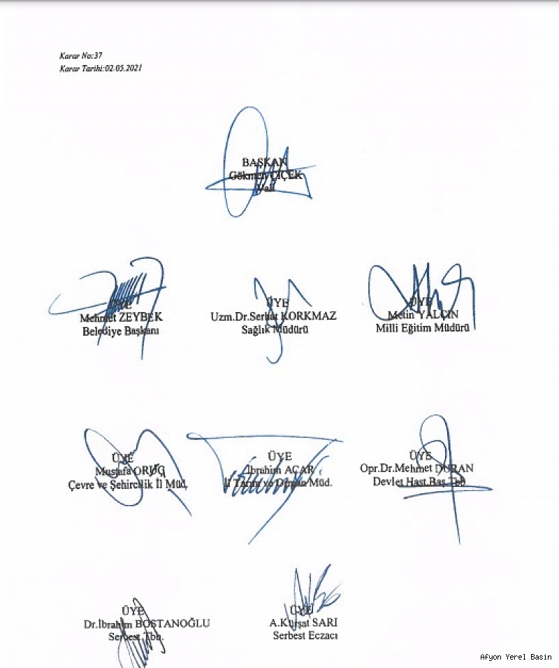İlimiz Hıfzıssıhha Meclisi 02.05.2021 tarihinde saat 14.00’da Vali Gökmen Çiçek’in Başkanlığında aşağıda isimleri ve imzaları bulunan üyelerin iştiraki ile toplanarak aşağıdaki kararlar alınmıştır.