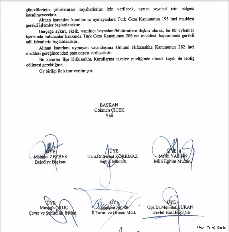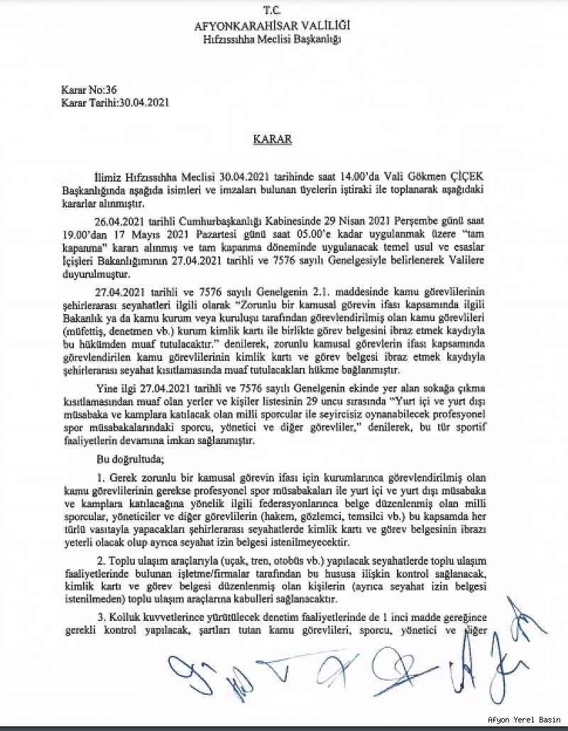 İlimiz Hıfzıssıhha Meclisi 30.04.2021 tarihinde saat 14.00’da Vali Gökmen Çiçek’in Başkanlığında aşağıda isimleri ve imzaları bulunan üyelerin iştiraki ile toplanarak aşağıdaki kararlar alınmıştır.
