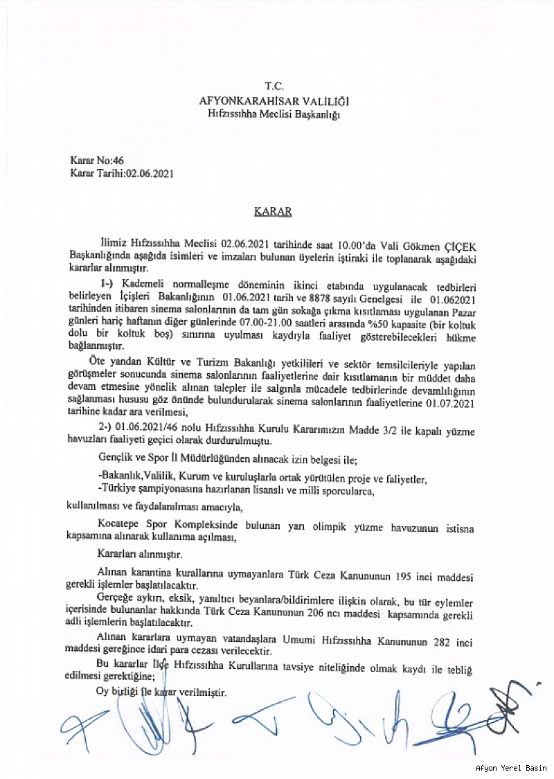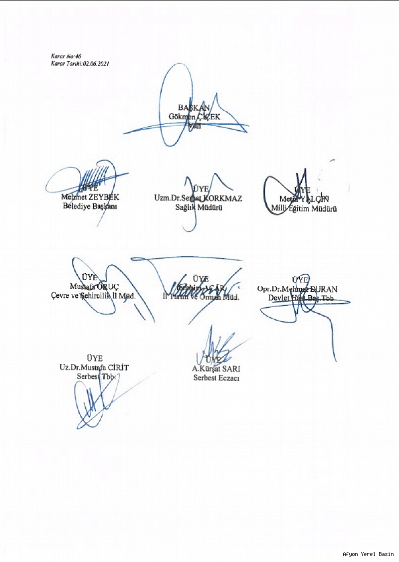 İlimiz Hıfzıssıhha Meclisi 02.06.2021 tarihinde saat 10.00’da Vali Gökmen Çiçek’in Başkanlığında aşağıda isimleri ve imzaları bulunan üyelerin iştiraki ile toplanarak aşağıdaki kararlar alınmıştır.