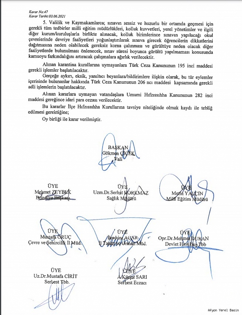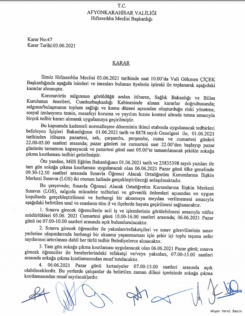 İlimiz Hıfzıssıhha Meclisi 03.06.2021 tarihinde saat 10.00’da Vali Gökmen Çiçek’in Başkanlığında aşağıda isimleri ve imzaları bulunan üyelerin iştiraki ile toplanarak aşağıdaki kararlar alınmıştır.