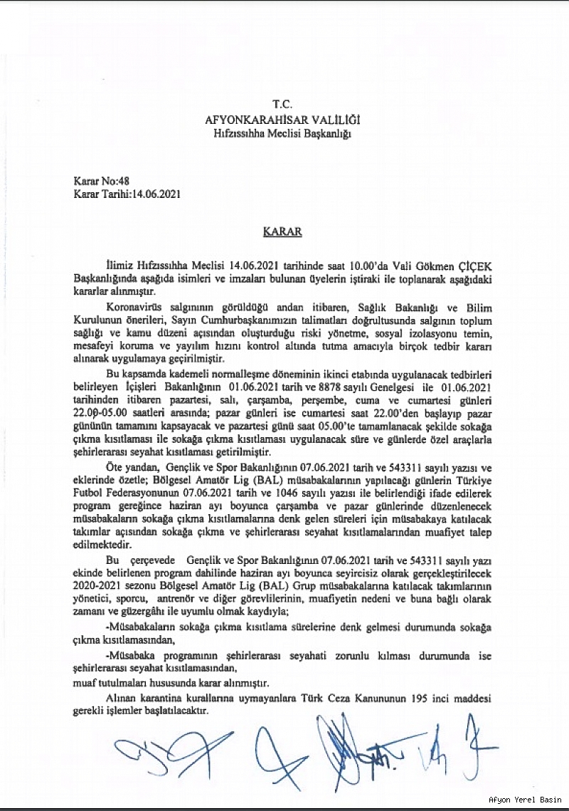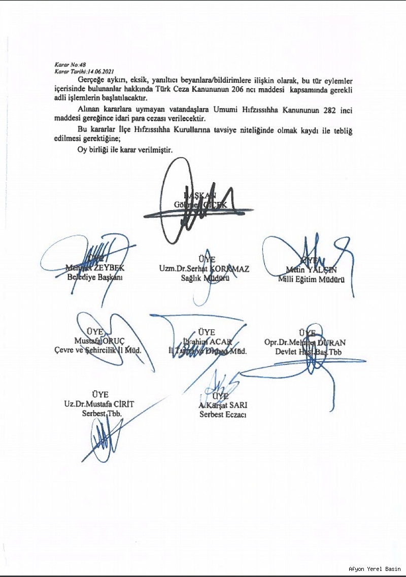 İlimiz Hıfzıssıhha Meclisi 14.06.2021 tarihinde saat 10.00’da Vali Gökmen Çiçek’in Başkanlığında aşağıda isimleri ve imzaları bulunan üyelerin iştiraki ile toplanarak aşağıdaki kararlar alınmıştır.