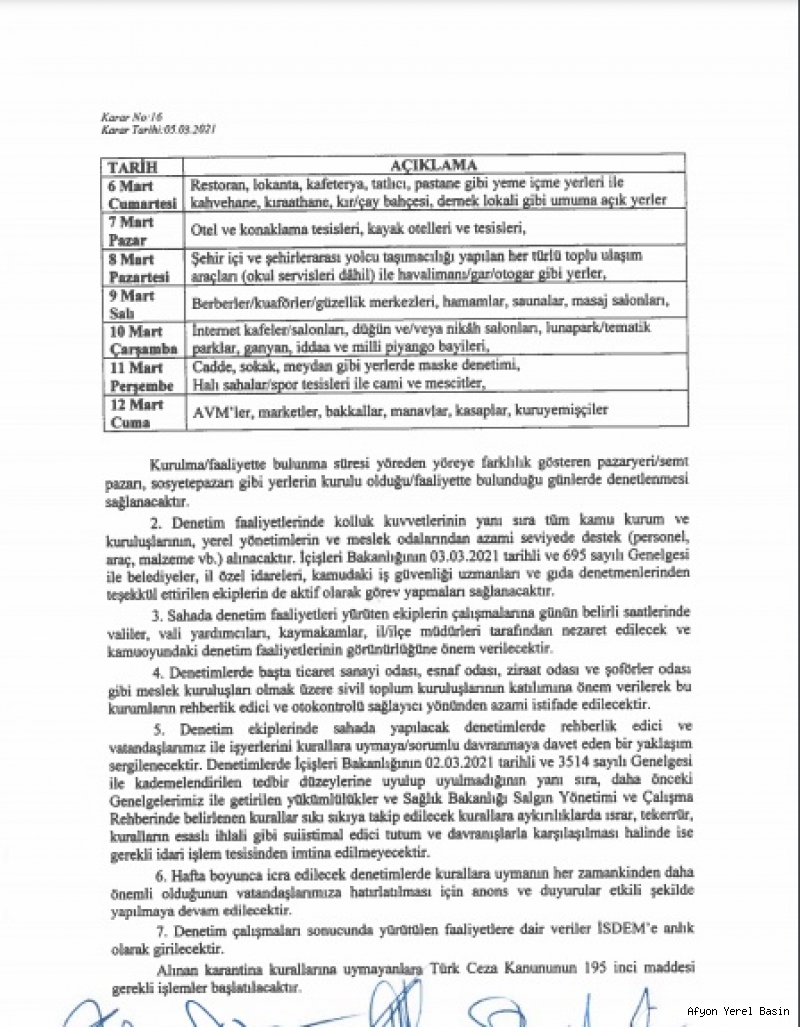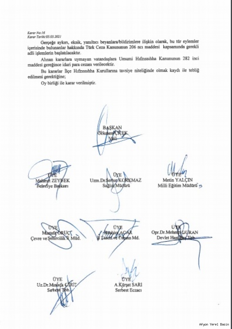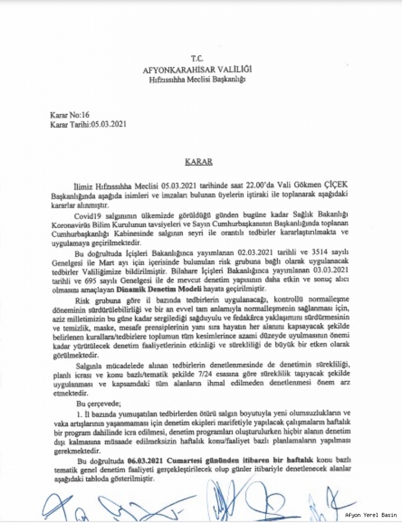İlimiz Hıfzıssıhha Meclisi 05.03.2021 tarihinde saat 22.00'da Vali Gökmen ÇİÇEK Başkanlığında aşağıda isimleri ve imzalan bulunan üyelerin iştiraki ile toplanarak aşağıdaki kararlar alınmıştır.