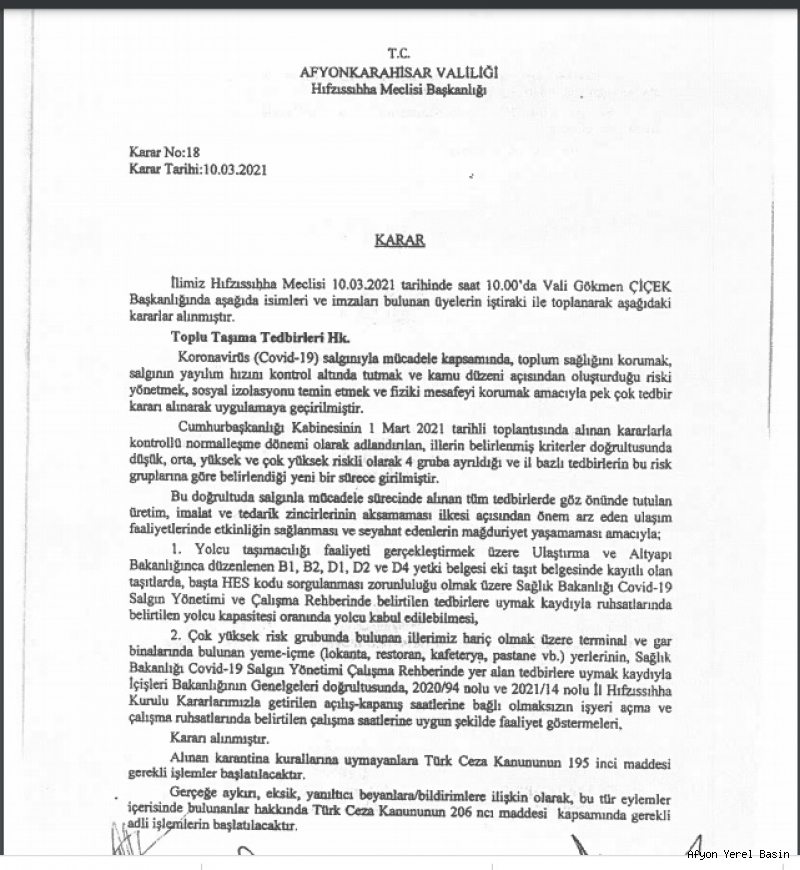İlimiz Hıfzıssıhha Meclisi 10.03.2021 tarihinde saat 10.00'da Vali Gökmen ÇİÇEK Başkanlığında aşağıda isimleri ve imzalan bulunan üyelerin iştiraki ile toplanarak aşağıdaki kararlar alınmıştır.