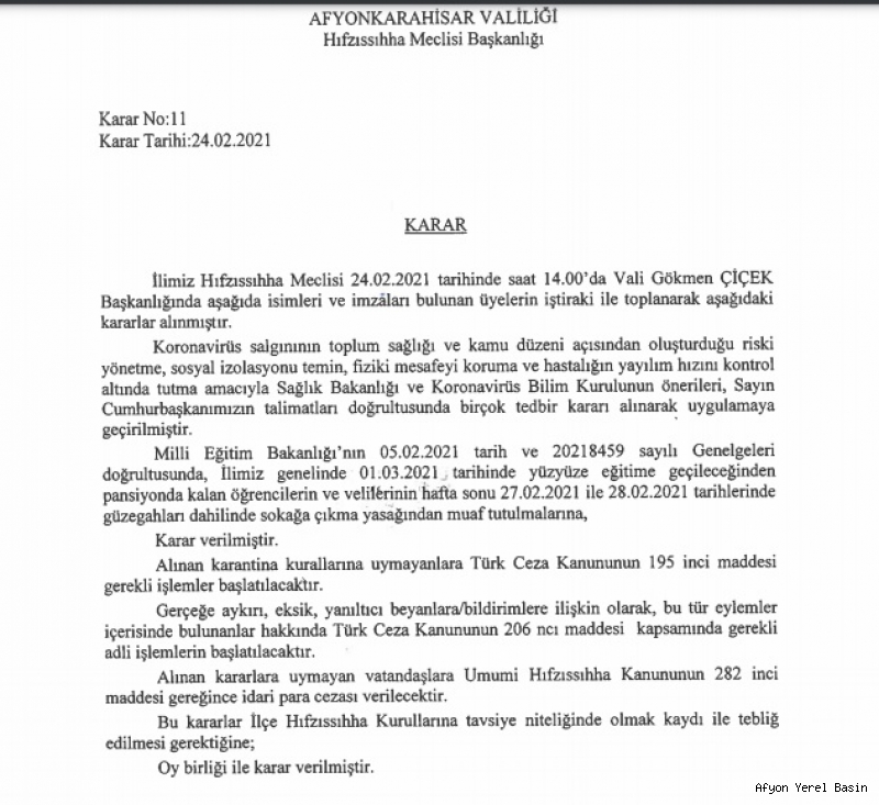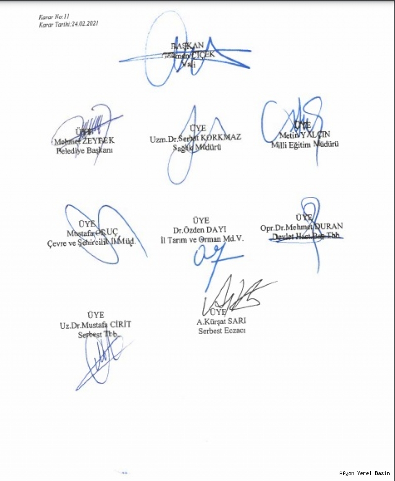 İlimiz Hıfzıssıhha Meclisi 24.02.2021 tarihinde saat 14.00'da Vali gökmen ÇİÇek Başkanlığında aşağıda isimleri ve imzaları bulunan üyelerin iştiraki ile toplanarak aşağıdaki kararlar alınmıştır.