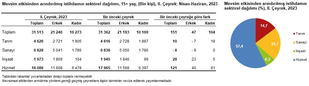 Mevsim etkisinden arındırılmış istihdam edilenlerin sayısı 2023 yılı II. çeyreğinde bir önceki çeyreğe göre sanayi sektöründe 8 bin kişi azalırken, tarım sektöründe 10 bin kişi, inşaat sektöründe 28 bin kişi, hizmet sektöründe 121 bin kişi arttı. İstihdam edilenlerin %14,7'si tarım, %21,7'si sanayi, %6,3'ü inşaat, %57,4'ü ise hizmet sektöründe yer aldı.