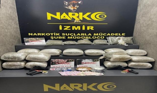 İzmir'in Konak ilçesinde 19 kilo 410 gram esrar ile 503 gram kokainin ele geçirildiği operasyonda gözaltına alınan şüpheli tutuklandı.İl Emniyet Müdürlüğü Narkotik Suçlarla Mücadele Şubesi ekipleri, Konak'ta uyuşturucu madde ticareti yapılan bir adrese baskın düzenledi.Operasyonda 19 kilo 410 gram esrar, 503 gram kokain, hassas terazi, 2 tabanca ile 105 fişek ve 3 şarjör ele geçirildi. Adreste bulunan şüpheli gözaltına alındı.Emniyetteki işlemlerinin ardından adliyeye sevk edilen zanlı çıkarıldığı hakimlikçe tutuklandı.