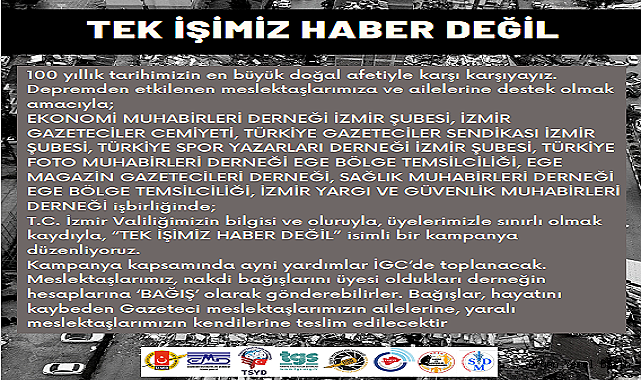Türkiye Cumhuriyeti’nin 100 yıllık tarihinin en büyük doğal afetiyle karşı karşıya kaldığımız süreçte tüm meslek grupları 10 ilimizde, 15 milyon insanımızı etkileyen depremin yaralarını sarmak için seferber olmuş durumda. İzmirli basın meslek kuruluşları da, depremden etkilenen meslektaşlarına ve ailelerine destek olmak amacıyla harekete geçti.İzmir Gazeteciler Cemiyeti, Ekonomi Muhabirleri Derneği İzmir Şubesi, Türkiye Gazeteciler Sendikası İzmir Şubesi, Türkiye Spor Yazarları Derneği İzmir Şubesi, Türkiye Foto Muhabirleri Derneği Ege Bölge Temsilciliği, Ege Magazin Gazetecileri Derneği, Sağlık Muhabirleri Derneği Ege Bölge Temsilciliği ve İzmir Yargı ve Güvenlik Muhabirleri Derneği, “TEK İŞİMİZ HABER DEĞİL” isimli kampanyada güçlerini depremzede gazeteciler için birleştirdi.T.C. İzmir Valiliği’nin bilgisi ve oluruyla yürütülen kampanya kapsamında ayni bağışlar, İzmir Gazeteciler Cemiyeti’nde toplanıyor. İGC, ayni yardımları İzmir Büyükşehir Belediyesi’ne teslim edecek. İzmirli gazetecilerin ayni yardımlarının depremzedelere ulaştırılmasına İzmir Büyükşehir Belediyesi aracılık edecek.Gazeteciler, nakdi bağışlarını üyesi oldukları meslek örgütünün hesap numaralarına ‘BAĞIŞ’ olarak gönderebiliyorlar. Gazeteci olmayan vatandaşlarda arzu ettikleri takdirde kampanyada yer alan derneklerin hesap numaralarına bağışta bulunabilecekler.“TEK İŞİMİZ HABER DEĞİL” isimli kampanyamıza haberleriyle destek vermek isteyen meslektaşlarımız ekteki görsele haberlerinde yer verebilirler. Kampanyaya nakdi destek vermek isteyen gazeteciler ve vatandaşlarımız kampanyaya katılan İzmir basın kuruluşlarıyla iletişime geçerek yol alabilirler.Saygılarımızla,İZMİR GAZETECİLER CEMİYETİ