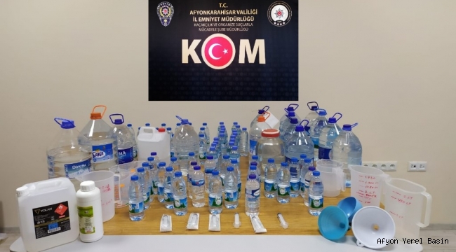 İl Emniyet Müdürlüğü görevlilerince İlimiz Sandıklı İlçesinde yılbaşı günü kaçak ve sahte alkol satışını önlemek amacı ile tespit edilen 5 ayrı iş yeri ve ikamete yönelik olarak yapılan arama neticesinde;- 113,5 Litre pet şişelere doldurulmuş sahte alkol,- 1 Litre etil alkol,- 1 Kilogram anason aroması,- 8 adet sahte alkol üretiminde kullanılan plastik maşrapa,- 3 adet sahte alkol yapımında kullanılan plastik huni,- 6 adet sahte alkol üretiminde kullanılan şırınga,ele geçirilmiş olup, 4 şüpheli şahıs gözaltına alınmıştır. Gözaltına alman şahıslara 5607 Sayılı Kanun Kapsamında adli işlem yapıldığı bildirildi.