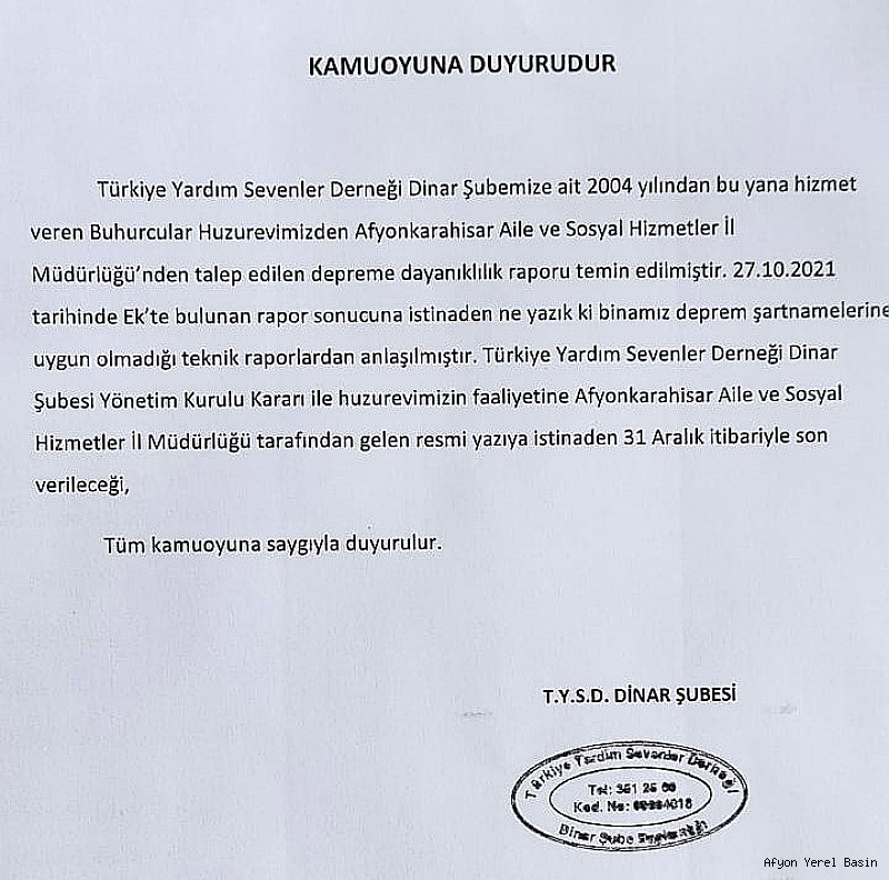 Türkiye Yardım Sevenler Derneği dinar Şubemize ait 2004 yılından bu yana hizmet veren Buhurcular Huzurevinden Afyonkarahisar Aile ve Sosyal Hizmetler İl Müdürlüğünden talep edilen depreme dayanıklılık raporu temin edilmiştir 27.10.2021 tarihinde ek te bulunan rapor sonucuna istinaden ne yazık ki binamız deprem şart nağmelerine uygun olmadığı teknik raporlardan anlaşılmıştır.Türkiye Yardım Sevenler Derneği Dinar Şubesi yönetim kurulu kararı ile huzurevimizin faaliyetlerine Afyonkarahisar Aile ve Sosyal Hizmetler il müdürlüğü tarafından gelen resmi yazıya istinaden 31 Aralık itibari ile son verileceği tüm kamuoyuna saygıyla duyurulur.T.Y.S.D. Dinar Şubesi