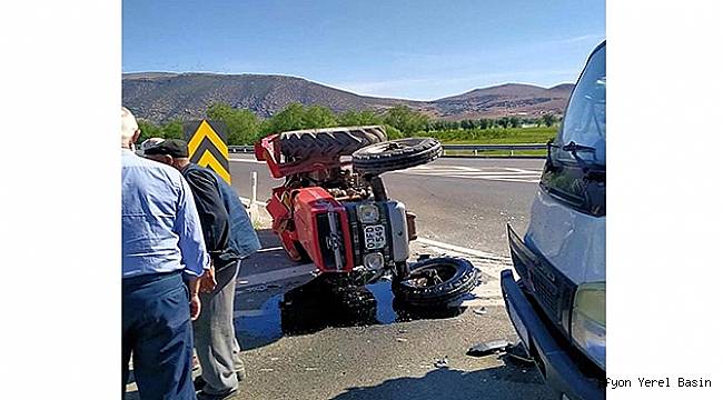 Kaza, saat 09.40 sıralarında Dinar- Çivril yolunda meydana geldi.Hidayet Y.’ın kullandığı 20 ADU 217 plakalı Sulama Malzemesi yüklü Kamyonet, Denizli Çivril ilçesine doğru ilerlerken Çakıcı köyü yönünden Dinar ilçesine giden Ramazan D.’in kullandığı 03 FD 549 plakalı Traktör ile dönel kavşakta çarpıştı. Çarpışmanın etkisiyle devrilen Traktörün Sürücüsü Ramazan D. yaralandı. Kamyonetin sürücüsü Hidayet Y. ise kazayı yara almadan atlattı.İhbar üzerine kaza yerine 112 sağlık ekipleri, trafik polisleri ve Karayolları ekipleri geldi. 112 Sağlık ekipleri Ramazan D.’e yaptığı ilk müdahalenin ardından Dinar Devlet Hastanesine götürdü. Trafik Polisleri kaza ile ilgili işlem başlattı.Kazaya karışan araçlarda maddi hasar oluşurken çekici yardımıyla araçlar dönel kavşaktan kaldırıldı.Kaynak: Dinar Gündem Gazetesi