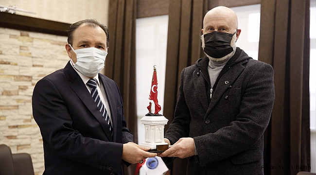 Ziyarette Sanatçı Mustafa Kemal Altınsoy tarafından Rektör Karakaş’a Şehit Sancaktar Anıtı minyatürü takdim edildi. Rektör Karakaş, nazik ziyaretlerinden dolayı misafirlerine teşekkür etti.