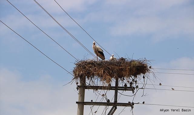 Afyonkarahisar'ın Sandıklı ilçesinde leylekler, 15 yıldır aynı elektrik direğine yuva yapıyor.