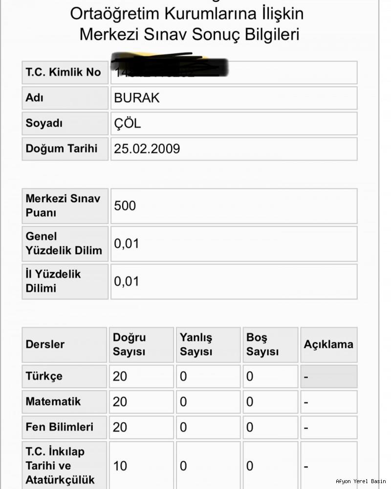 Sandıklı Belediye Başkanı Mustafa Çöl'ün oğlu Burak Çöl, 2023 LGS sınavında Türkiye birincisi oldu. Bu önemli başarı, ilçe için büyük bir gurur kaynağı olurken Burak Çöl, yoğun çalışmaları ve gayretleri sonucunda 500 tam puan alarak birincilik başarısını elde etti Sandıklı Belediye Başkanı Mustafa Çöl, oğlunun bu başarısını sosyal medya hesabından paylaşarak sevincini dile getirdi. Başkan Çöl, paylaşımında oğlunu can-ı gönülden kutladığını belirterek, başarıda emeği geçen okul ve dershane idarecilerine, öğretmenlere teşekkür etti.Burak Çöl’ün elde ettiği bu başarı, Sandıklı ilçesi için büyük bir gurur kaynağı olurken Türkiye genelinde ortaokul öğrencilerinin liseye geçiş sürecini belirleyen önemli bir sınav olan LGS’den 500 tam puan alarak Türkiye birincisi olan Çöl’ün, yoğun çalışma ve gayretinin sonucu bu uzun soluklu maratonda başarıyı elde ettiği belirtildi.AFYON’DAN 10 BİN ÖĞRENCİLGS kapsamında 4 Haziran tarihinde uygulanan merkezi sınavın sonuçlarının açıklanmasının ardından en çok merak edilen konulardan biri olan LGS’den Afyonkarahisar birinci çıkmayacağı konusu yanıt buldu. Türkiye genelinde 1 milyon 30 bin 195 öğrenci girerken, katılım oranı yüzde 82 olarak gerçekleşti. LGS’de Afyonkarahisar’dan ise 10 bin 101 öğrenci ter döktü.Her yıl düzenlenerek ortaokul öğrencilerinin liseye geçiş sürecini belirleyen LGS sınavında tüm soruları cevaplayarak 500 tam puan almaya hak kazanıyor. İşte bu yıl düzenlenen LGS sınavının Afyonkarahisar Türkiye birincilerinin listesi ise şöyle:LGS AFYON TÜRKİYE BİRİNCİLERİ1- Sena Altuntuğ Şemsetin Karahisar Ortaokulu2- Melis Altuntuğ Şemsetin Karahisar Ortaokulu3- Zeynep Şengül Hacı Ahmet Özsoy Ortaokulu4- Elif Aytulun Kocatepe Ortaokulu5- Ahmet İşbilir Neziha Aslan Ortaokulu6- Gürkanalp Çetinkaya Hoca Ahmet Yesevi Ortaokulu7- Doruk Toker İstek Koleji8- Burak Çöl Özel Sandıklı Yunus Emre Ortaokulu HABER: BETÜL ÖZDEMİR