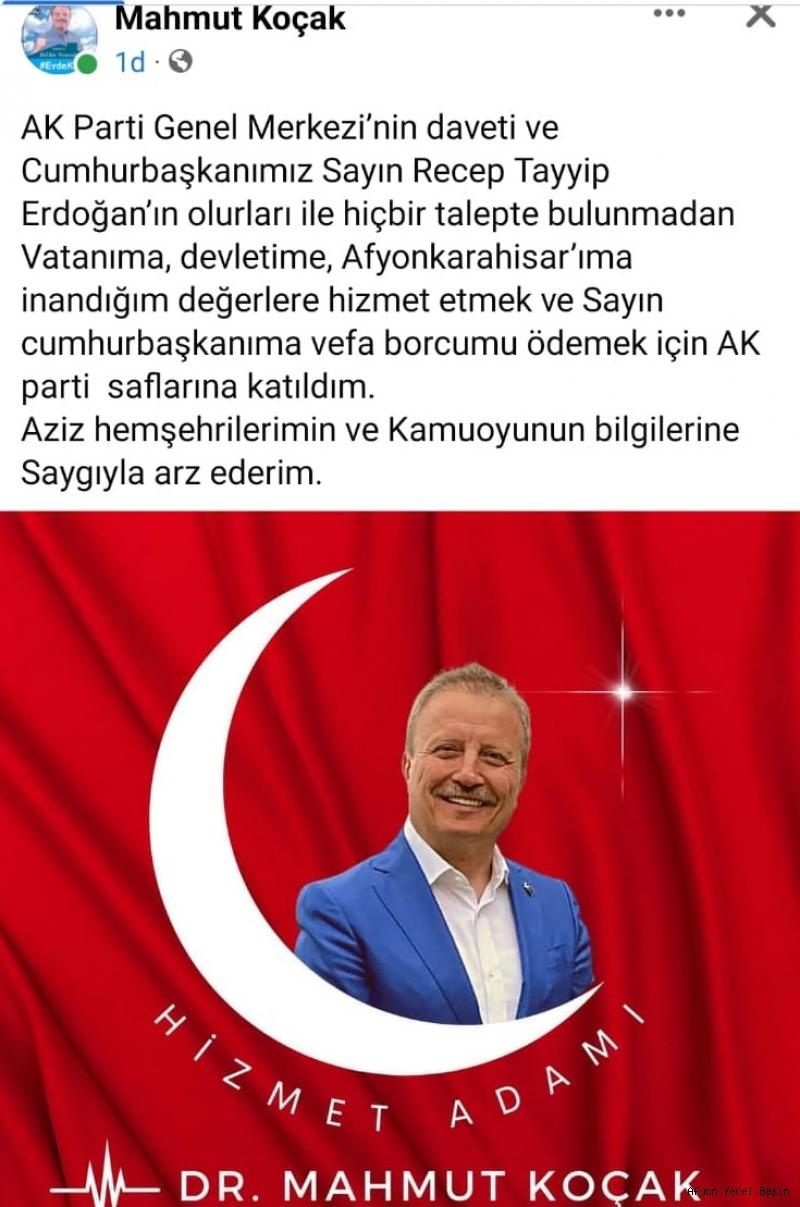 İYİ Parti’den istifa eden Mahmut Koçak kararını verdi!.. Mahmut Koçak, yeniden AK Parti’ye katıldı. Koçak, davetin AK Parti genel merkezinden geldiğini söyledi. Mahmut Koçak, sosyal medya üzerinden yani partisini açıkladı. Koçak, paylaşımında "AK Parti Genel Merkezi’nin daveti ve Cumhurbaşkanımız Sayın Recep Tayyip Erdoğan’ın olurları ile hiçbir talepte bulunmadan Vatanıma, devletime, Afyonkarahisar’ıma inandığım değerlere hizmet etmek ve Sayın cumhurbaşkanıma vefa borcumu ödemek için AK parti saflarına katıldım. Aziz hemşehrilerimin ve Kamuoyunun bilgilerine Saygıyla arz ederim” dedi.