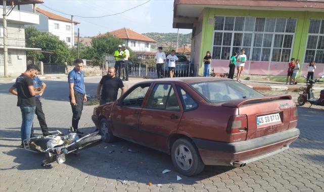 Manisa'nın Kula ilçesinde otomobille çarpışan motosikletteki 2 kişi yaralandı.Zaferiye Mahallesi Alparslan Caddesi'nde, M.A.D'nin (15) kullandığı 45 RA 7937 plakalı motosiklet, karşı yönden gelen Çağatay Üşümüş (27) idaresindeki 45 SB 8713 plakalı otomobil ile çarpıştı.Motosiklet sürücüsü ile yanındaki A.G (16) yaralandı.İhbar üzerine, olay yerine sağlık ve polis ekipleri sevk edildi.Yaralılar ambulansla hastaneye kaldırıldı.