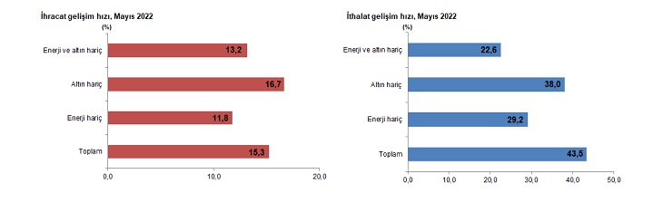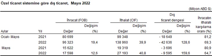 Özel ticaret sistemine göre, 2022 yılı Mayıs ayında, ihracat bir önceki yılın aynı ayına göre %12,6 artarak 17 milyar 598 milyon dolar, ithalat %40,8 artarak 27 milyar 193 milyon dolar olarak gerçekleşti.