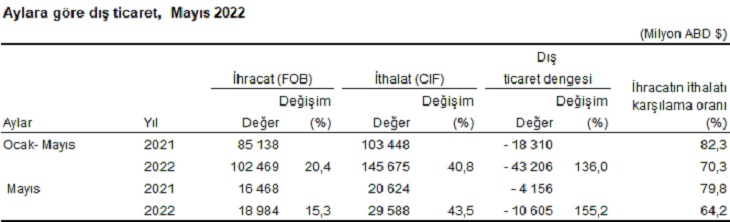 Ocak-Mayıs döneminde dış ticaret açığı %128,6 artarak 18 milyar 649 milyon dolardan, 42 milyar 636 milyon dolara yükseldi. İhracatın ithalatı karşılama oranı 2021 Ocak-Mayıs döneminde %81,2 iken, 2022 yılının aynı döneminde %69,3'e geriledi.