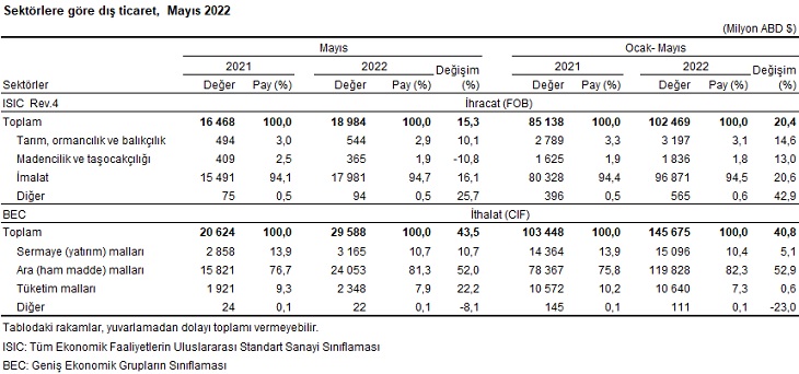 Genel ticaret sistemine göre ihracat 2022 yılı Ocak-Mayıs döneminde bir önceki yılın aynı dönemine göre %20,4 artarak 102 milyar 469 milyon dolar, ithalat %40,8 artarak 145 milyar 675 milyon dolar olarak gerçekleşti,