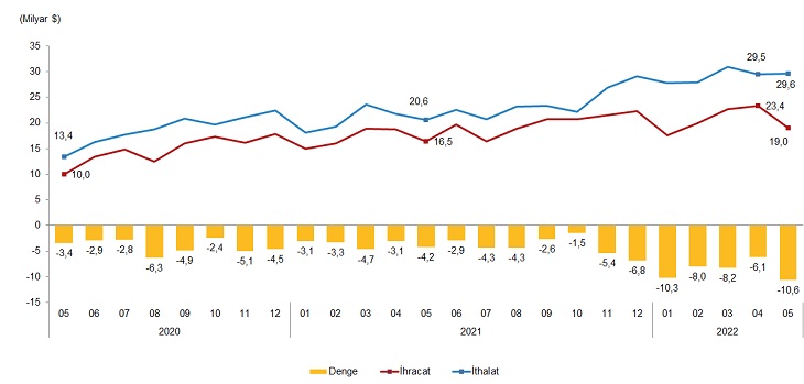 Mayıs ayında dış ticaret açığı bir önceki yılın aynı ayına göre %155,2 artarak 4 milyar 156 milyon dolardan, 10 milyar 605 milyon dolara yükseldi. İhracatın ithalatı karşılama oranı 2021 Mayıs ayında %79,8 iken, 2022 Mayıs ayında %64,2'ye geriledi.