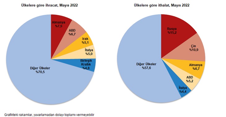 İthalatta Rusya Federasyonu ilk sırayı aldı. Mayıs ayında Rusya Federasyonu'ndan yapılan ithalat 4 milyar 487 milyon dolar olurken, bu ülkeyi sırasıyla; 3 milyar 234 milyon dolar ile Çin, 1 milyar 980 milyon dolar ile Almanya, 1 milyar 529 milyon dolar ile ABD, 1 milyar 305 milyon dolar ile İtalya izledi. İlk 5 ülkeden yapılan ithalat, toplam ithalatın %42,4'ünü oluşturdu.