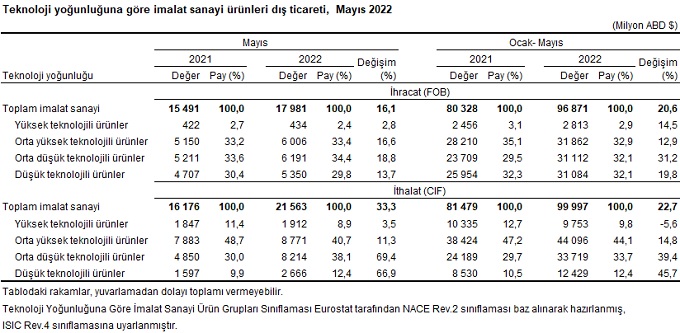 Teknoloji yoğunluğuna göre dış ticaret verileri, ISIC Rev.4 sınıflaması içinde yer alan imalat sanayi ürünlerini kapsamaktadır. Mayıs ayında ISIC Rev.4'e göre imalat sanayi ürünlerinin toplam ihracattaki payı %94,7'dir. Yüksek teknoloji ürünlerinin imalat sanayi ürünleri ihracatı içindeki payı %2,4'tür. Ocak-Mayıs döneminde ISIC Rev.4'e göre imalat sanayi ürünlerinin toplam ihracattaki payı %94,5'tir. Ocak-Mayıs döneminde yüksek teknoloji ürünlerinin imalat sanayi ürünleri ihracatı içindeki payı %2,9'dur.