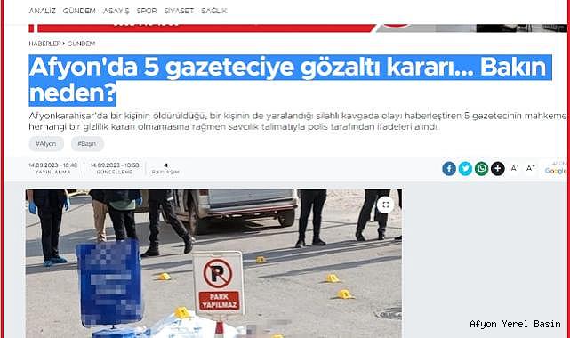 Afyonkarahisar Erenler mahallesinde bir hafta önce işlenilen cinayete Savcılık tarafından gizlilik kararı verilmesi sonrası, Cinayet görüntülerini işyeri sahibinin bilgisi dışında elde eden ve paylaştığı iddea edilen 5 Gazetecinin ifadesi alındı. Kendinin gazeteci olduğunu iddea eden bir kişi, Afyon'da 5 gazeteciye gözaltı kararı... Bakın neden? başlığı ile yayınladığı haberde 5 tane gazeteciye hakaret ettiğinin farkına bile varamadı. Cumhuriyet Başsavcılığı tarafından gözaltına alındığı iddea edilen ve ifadeleri alınan gazeteciler selbest bırakıldı. Kendini gazeteci zanneden kişi Savcılığıda zan altından bırakarak, mahkemeden herhangi bir gizlilik kararı olmamasına rağmen savcılık talimatıyla polis tarafından 5 gazetecinin ifadeleri alındığını belirtti. Oysa ki Cumhuriyet Savcılığının gizlilik kararını Gazeteciler Cemiyet Başkanı Sezer Küçükkurt açıklamıştı. İki akraba arasında 6 Eylül'de Erenler Mahallesinde E.S. (25) isimli şahıs aralarında husumet bulunan dayıları İ.K. (45) ve K.K. (40) ile karşılaşmış, pompalı tüfekle 1 kişi ölmüş, bir kişi yaralanmıştı. Daha dün Emniyet Müdürüne küfür etti diye yalan haber yapan, kendisinin gazeteci olduğunu iddea eden kişi, haberde Polis ekiplerine gönderme yaparak "polis noktasına yaklaşık 100 metre kala yaşanan olay" diyerek ne kast ettiğini kamuoyu anladı. Afyonkarahisar Cumhuriyet Savcılığı tarafından ifadelerinin alınması için gözaltı kararı çıkarıldığını belirten sözde gazeteci, gözaltı kararı diyerek meslektaşlarını kamuoyu önünde küçük düşürdü.