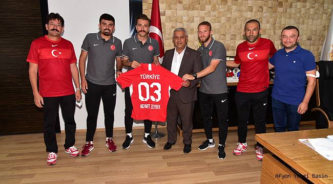 Ziyarete Türkiye İşitme Engelliler Futbol Milli Takım Teknik Direktörü Ramazan Karacif’in yanı sıra Tercüman Guddusi Aydın, futbolcular Ersin Mert, Eşref Metin Su ve Afyonkarahisarlı hemşehrimiz Emre Kılınç ile Tur Organizatörü Uğur Bıçakcı katıldı. Çek Cumhuriyeti maçı hazırlıkları için 15 Temmuz’da kampa giren milli takım, 26 Ağustos tarihine kadar şehrimizde kalacak. Ziyaretin anısına İşitme Engelli Futbol Milli Takımı Belediye Başkanımız Mehmet Zeybek’e 03 numaralı isminin yazılı olduğu Milli Takım formasını hediye etti.