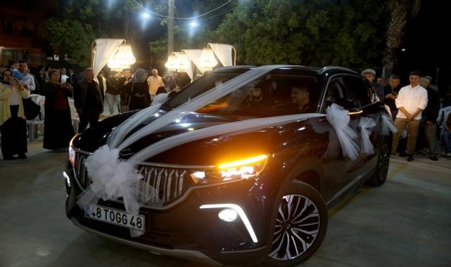 Muğla'nın Fethiye ilçesine tanıtım için getirilen Türkiye'nin yerli otomobili Togg, vatandaşların beğenisine sunulurken ayrıca nişanlanacak bir çift için de süslendi.