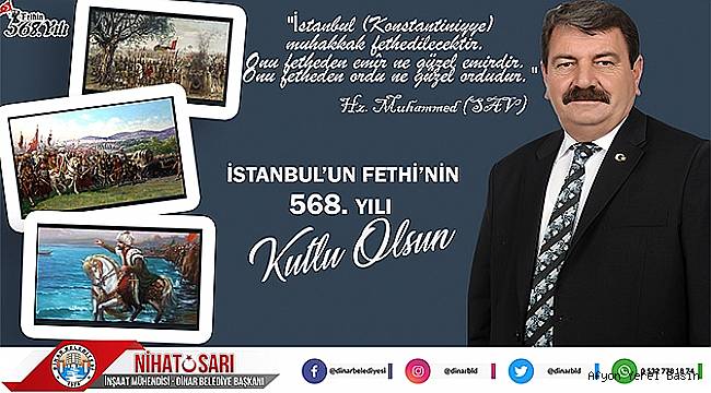 Dinar Belediye Başkanı Nihat Sarı, 29 Mayıs 1453 yılında İstanbul’un Fatih Sultan Mehmet tarafından fethedilişinin 568. yıldönümü nedeniyle bir mesaj yayımladı.