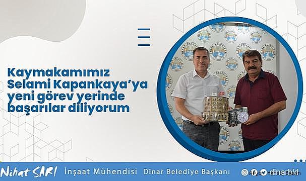 Ziyarette; Dinar Belediye Başkanımız Nihat Sarı, Dinar Kaymakamımız Selami Kapankaya’ya Dinarımızın simgesi Suçıkanımızın maketi ve saatini hediye ederek, ilçemizde görev süresi boyunca yaptığı hizmetler dolayısıyla teşekkür edip, yeni görev yerinde başarılar diledi.Dinar Gündem Gazetesi